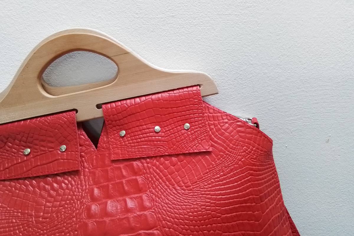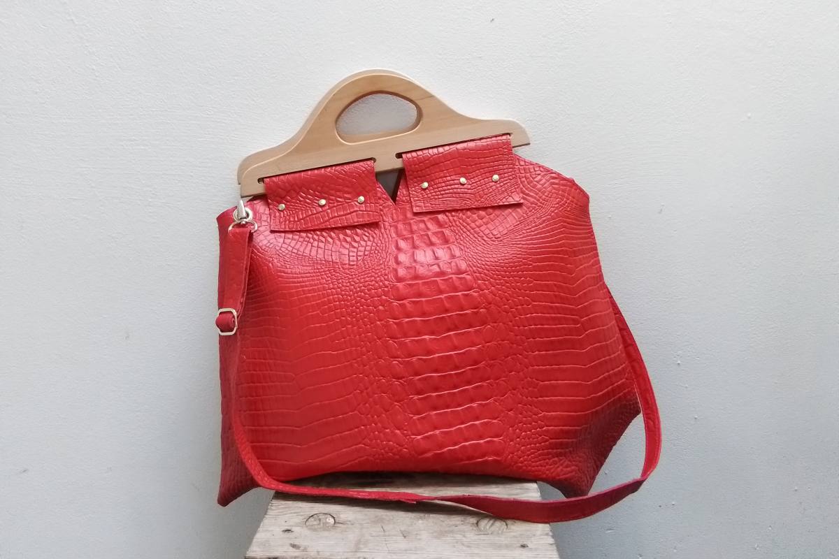 Unikatna velika usnjena torba asimetrične oblike v rdeči barvi z croco vzorcem se poda vsakemu stilu.