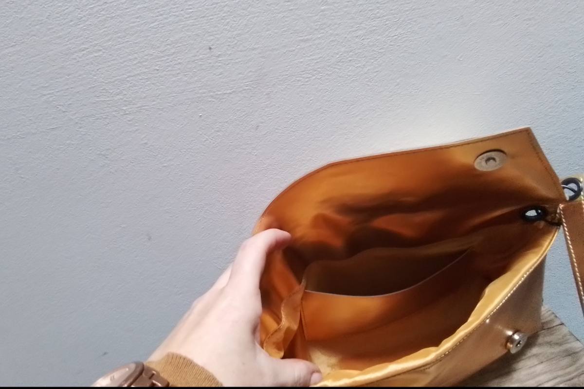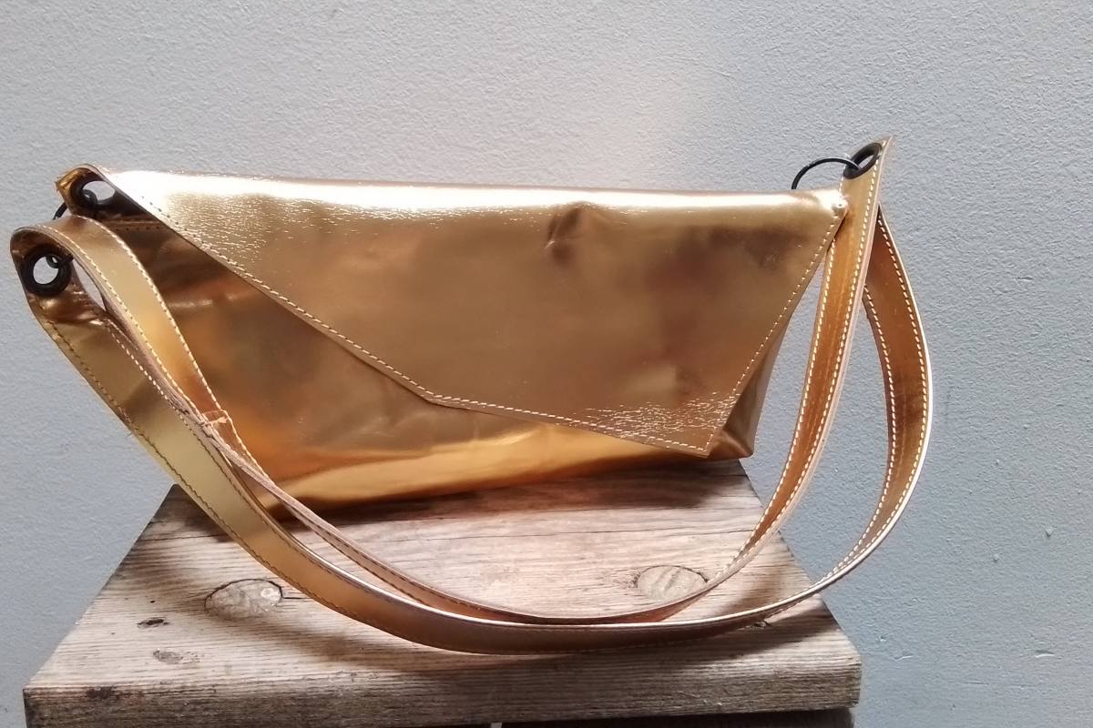 Unikatna majhna torbica v zlati barvi. Asimetrična,unikatna,majhna pa vendar krasen modni dodatek.
