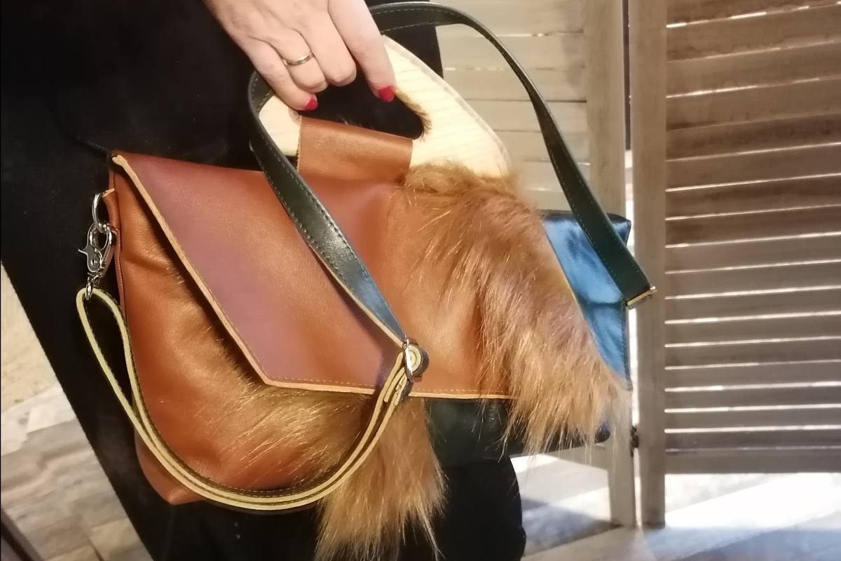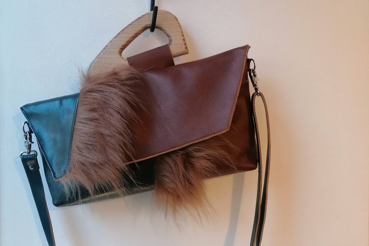 Torba je srednjevelika, unikatna, prostorna, priročna, modna,asimetrična....Torba za drzne....Torba ima dodan lesen ročaj ki je tudi unikaten in asimetričnih oblik...Torbica ima dodano umetno krzno in naredi torbico še bolj unikatno posebno....