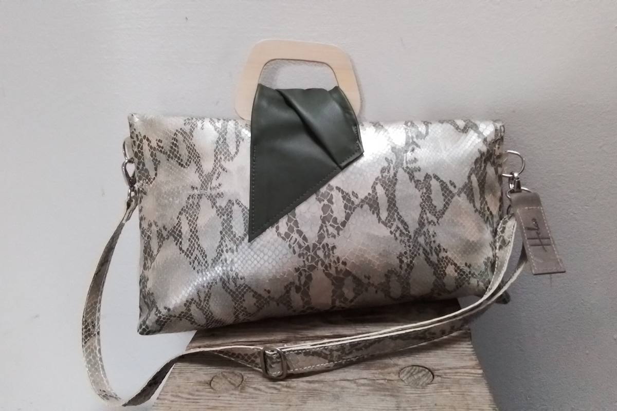 Torba je srednjevelika, unikatna, prostorna, priročna, modna,asimetrična.... Torba ima dodan lesen ročaj ki je tudi unikaten in asimetričnih oblik...in dolg pas za nošenje čez ramo....