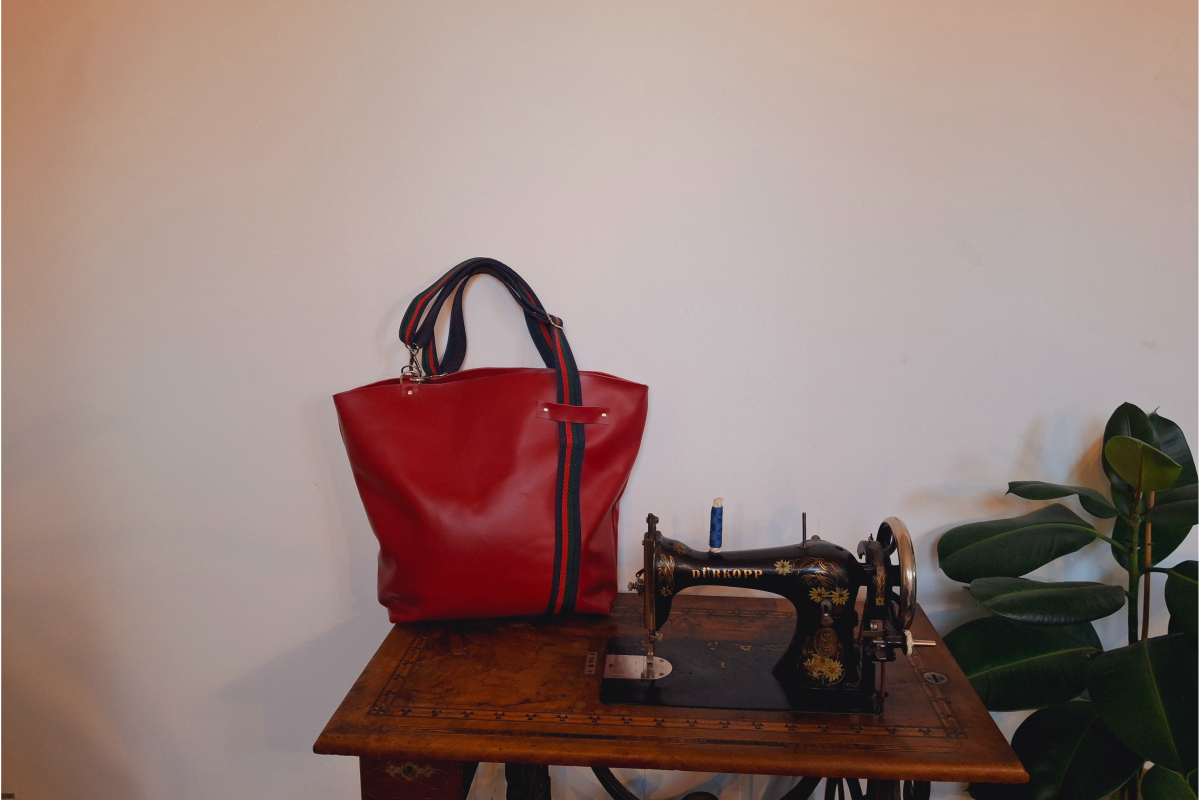 Unikatna usnjena torba v rdeči barvi in črtastih ročajev. Torba je velika, unikatna, prostorna, priročna, modna,.... V notranjosti ima žepa na zadrgo, da lahko pospraviš svoje dragocenosti in ne iščeš ključev po torbi...zapira se z zadrgo na vrhu.