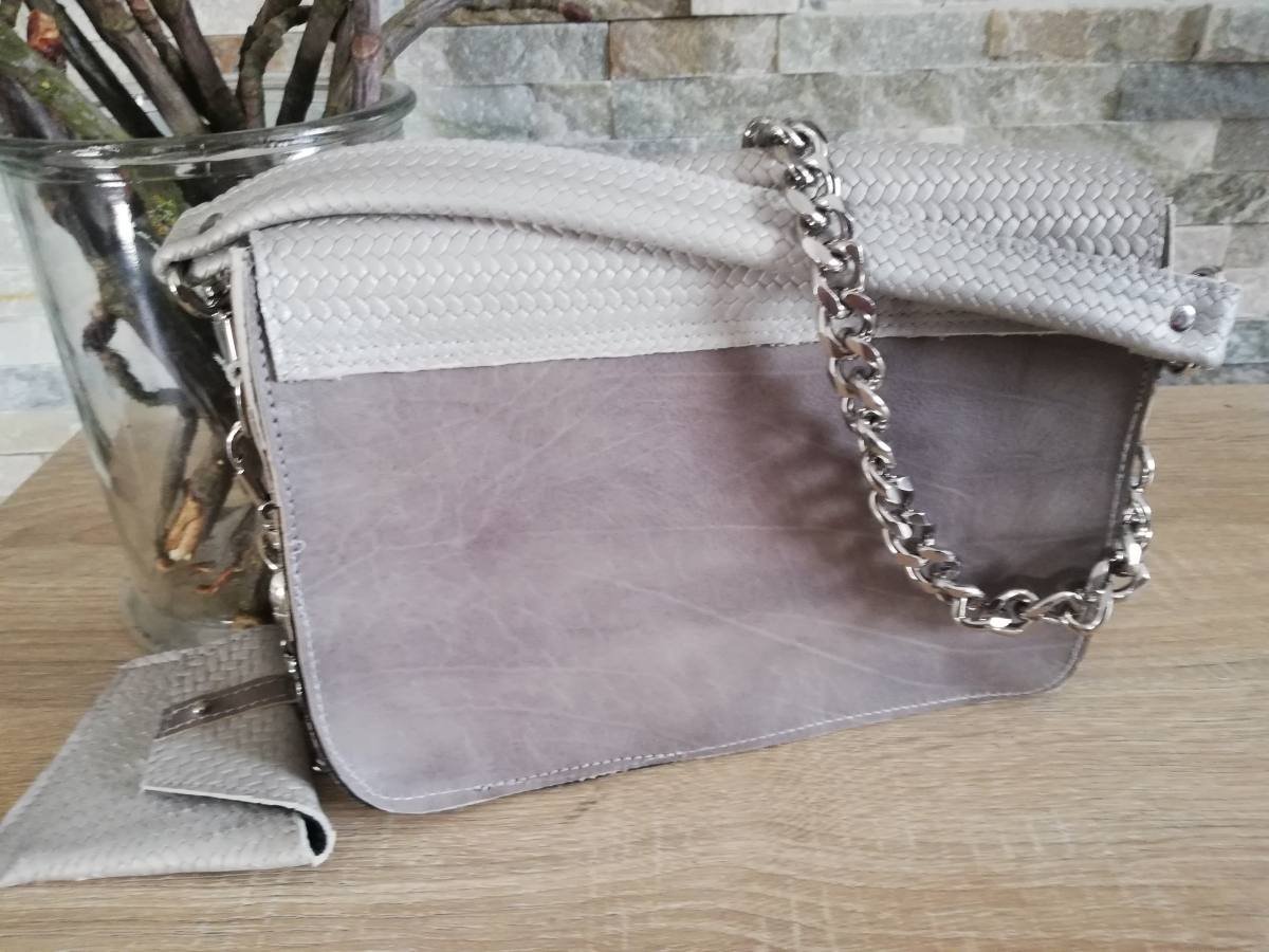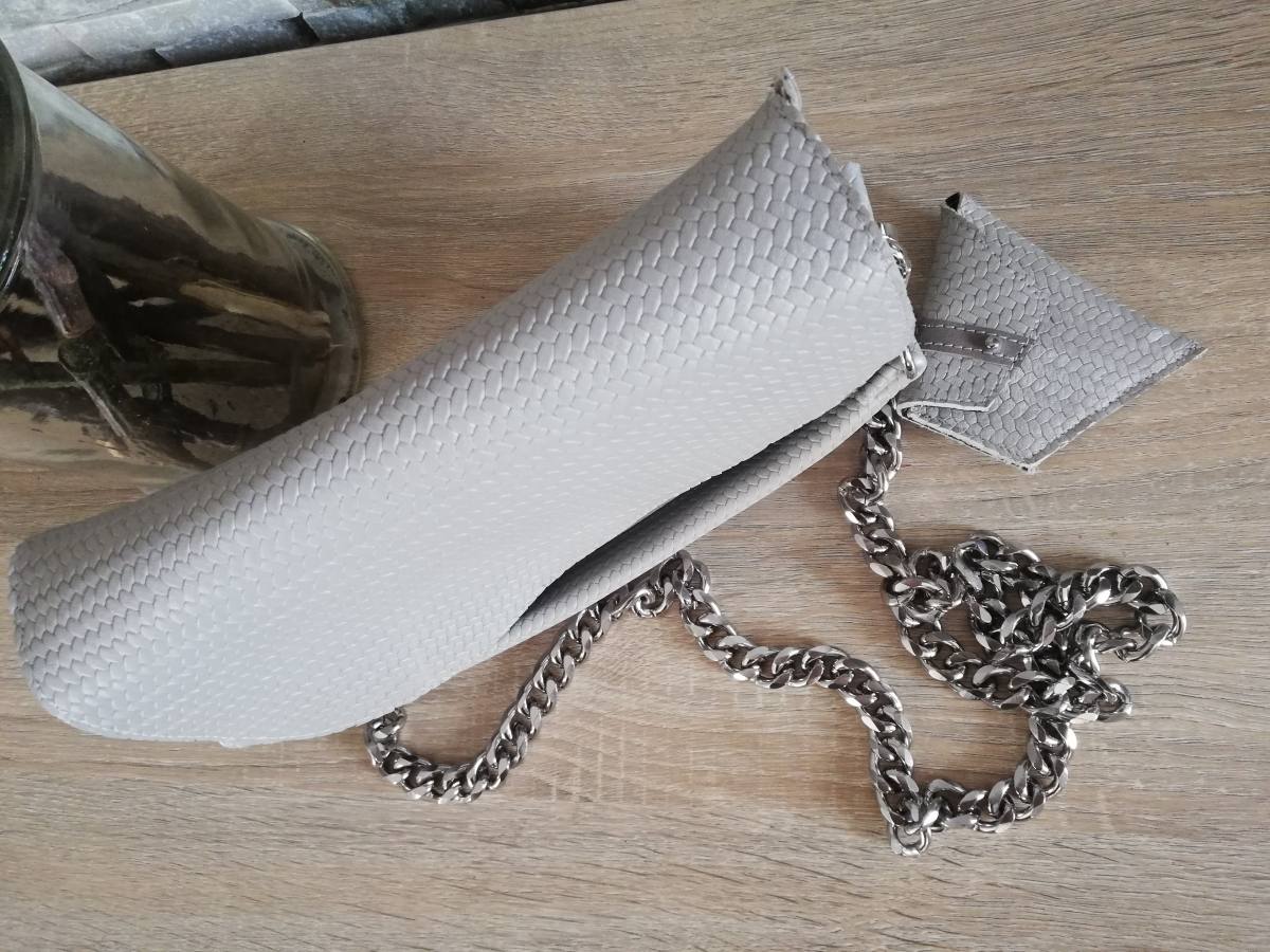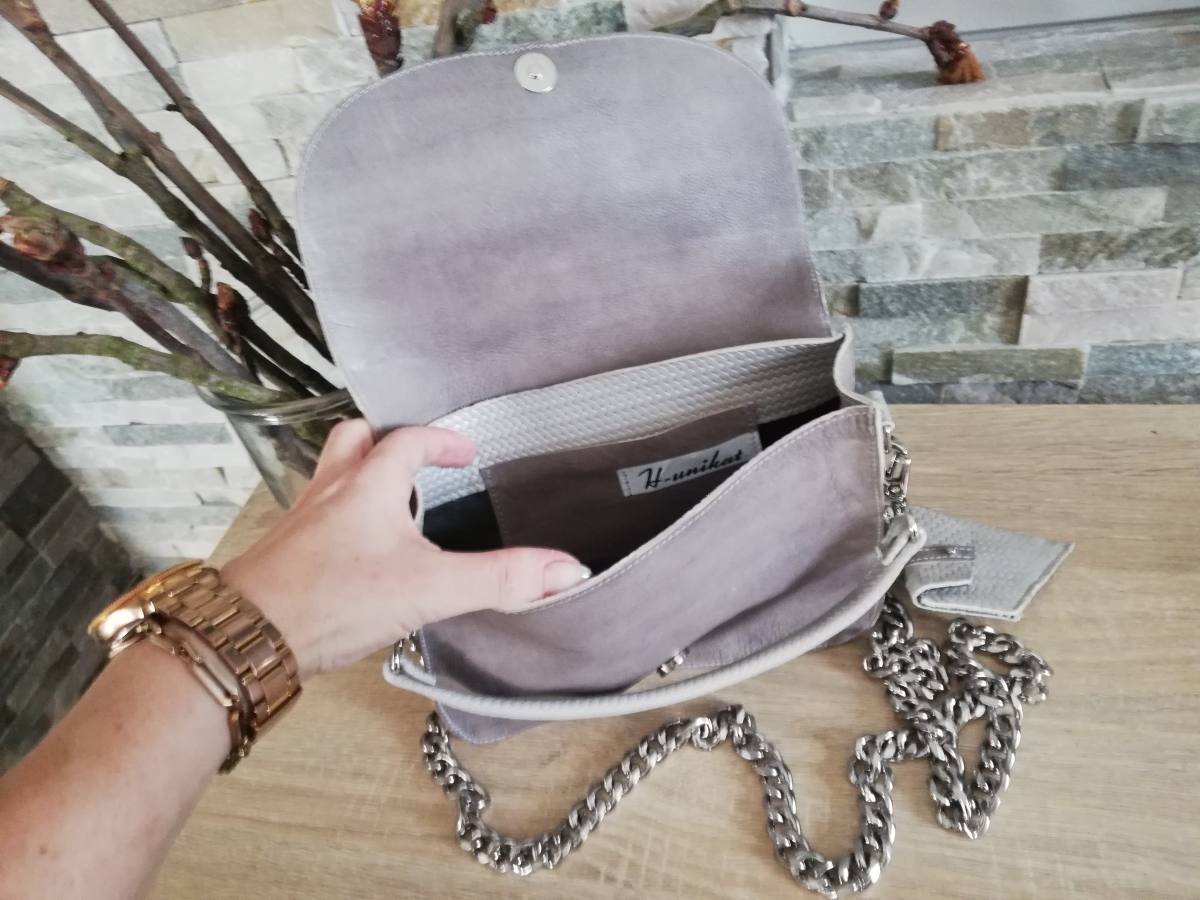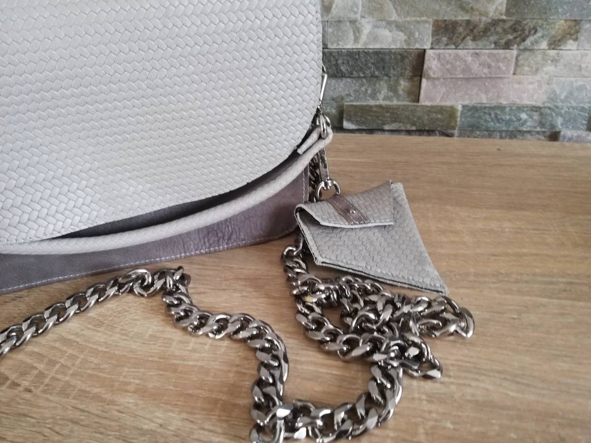 Unikatna manjša torbica v sivi barvi s kombinacijo vzorca srebrnih kitk. Ta čudovita modna torbica ima krajši pas za nošenje v roki in daljšo ketnico za nošenje torbice čez ramo. Oba pasova sta snemljiva. Torbica ima dodaten obesek s predalčkom za drobiž - drobižnico, ki ga lahko pripnete kamorkoli na torbico ali pa enostavno snamete.