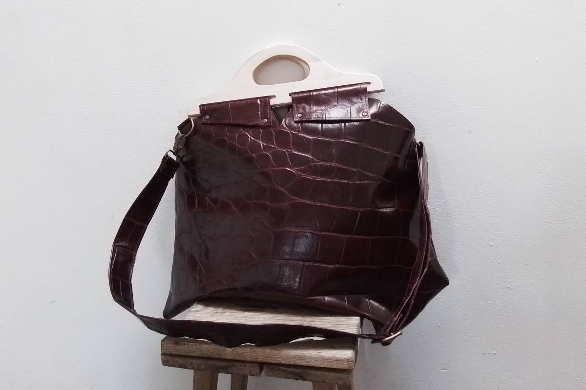 Unikatna velika usnjena torba asimetrične oblike v temno rdeči barvi z vzorcem se poda vsakemu stilu.