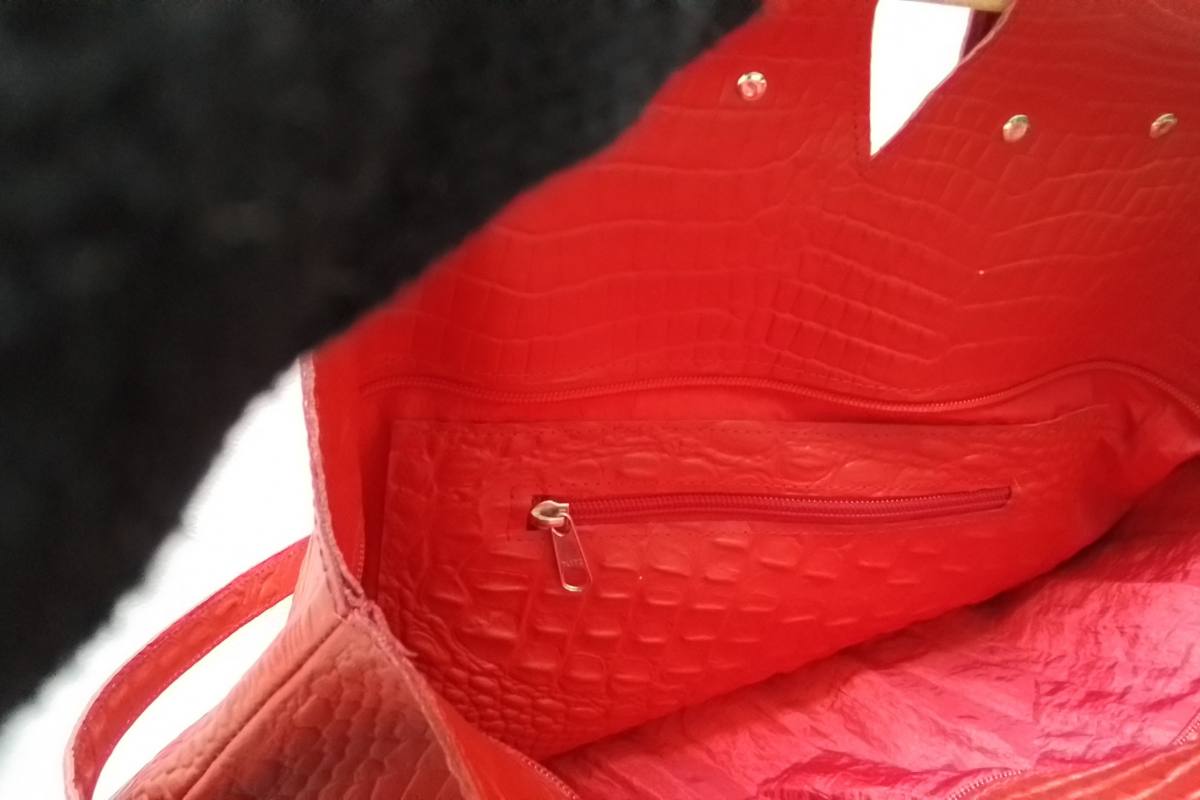 Unikatna velika usnjena torba asimetrične oblike v rdeči barvi z croco vzorcem se poda vsakemu stilu.