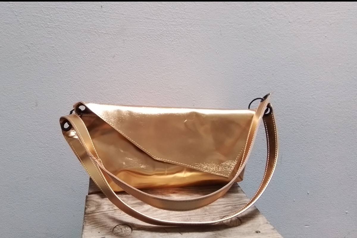Unikatna majhna torbica v zlati barvi. Asimetrična,unikatna,majhna pa vendar krasen modni dodatek.