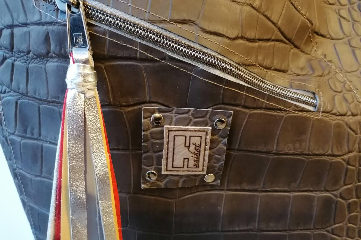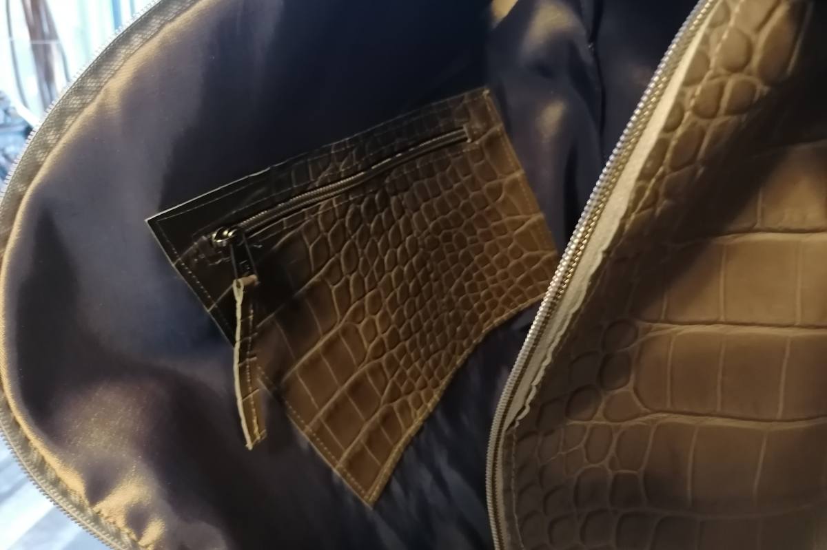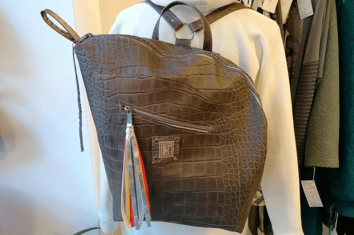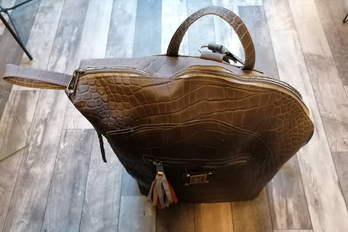 Asimetričen nahrbtnik primeren zanjo ali zanj. Za vse ki želijo iztopati ,biti drugačni...Nahrbtnik je sivorjave barve z croco vzorcem.