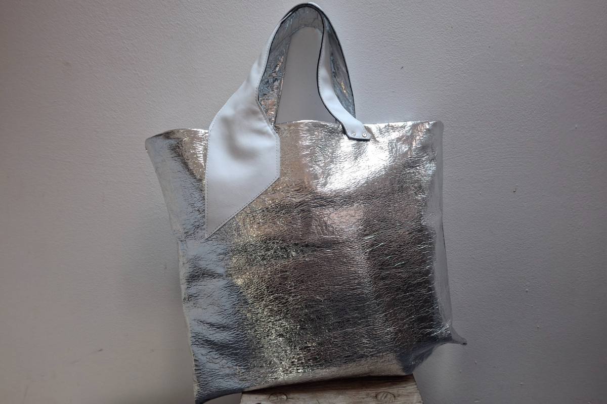 Asimetrična usnjena,srebrna tote bag