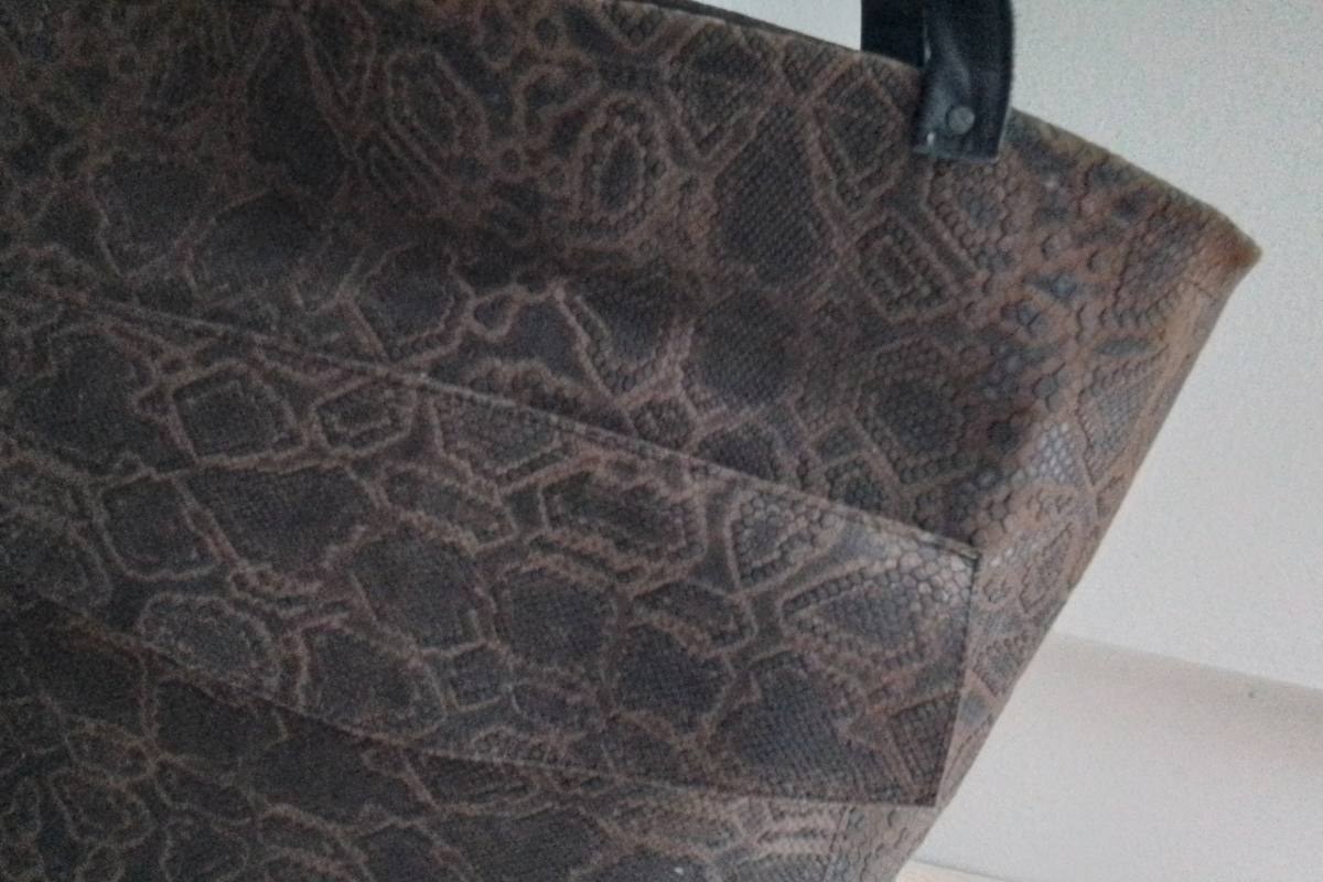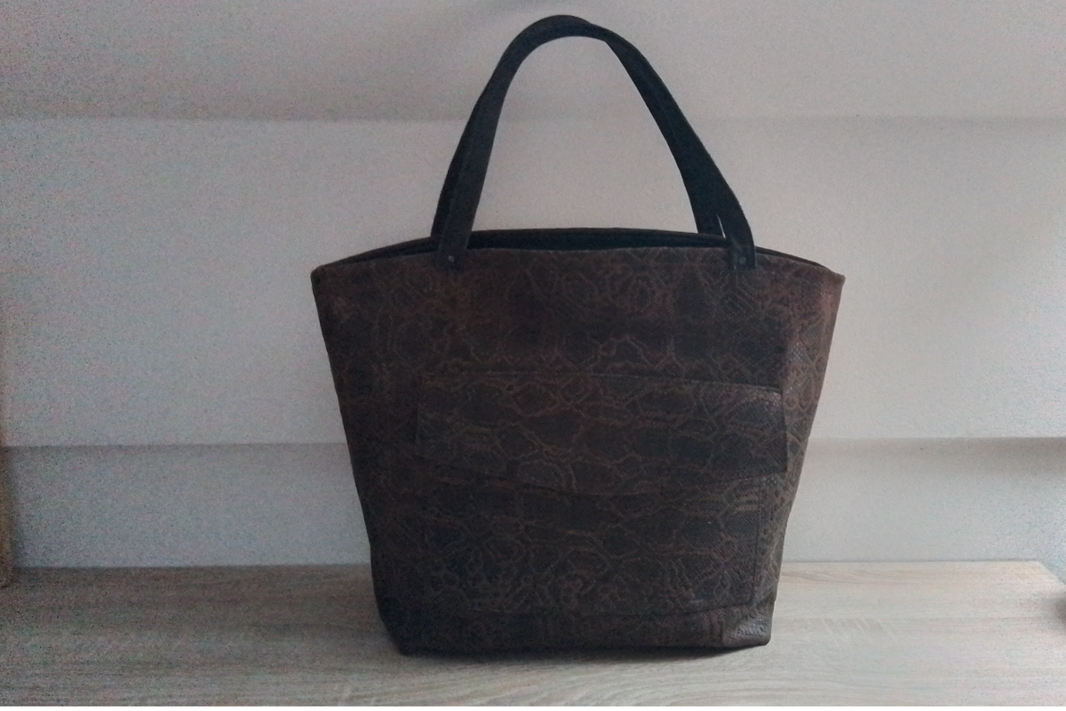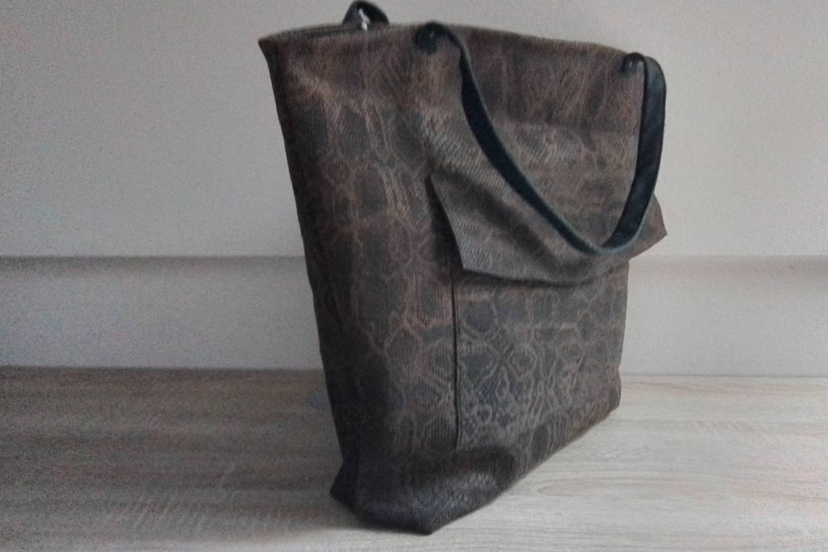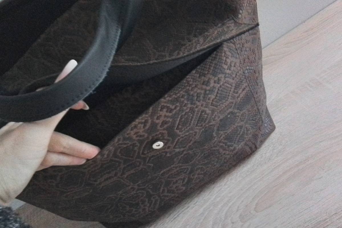 Unikatna usnjena v črnorjavi barvi in vzorcem pitona. Torba je velika, unikatna, prostorna, priročna, modna,.... V notranjosti ima žepa na zadrgo, da lahko pospraviš svoje dragocenosti in ne iščeš ključev po torbi...zapira se z zadrgo na vrhu.
