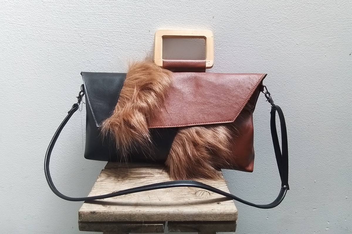 Torba je srednjevelika, unikatna, prostorna, priročna, modna,asimetrična.... Torba ima dodan lesen ročaj ki je tudi unikaten in asimetričnih oblik...Torbica ima dodano umetno krzno in naredi torbico še bolj unikatno posebno....