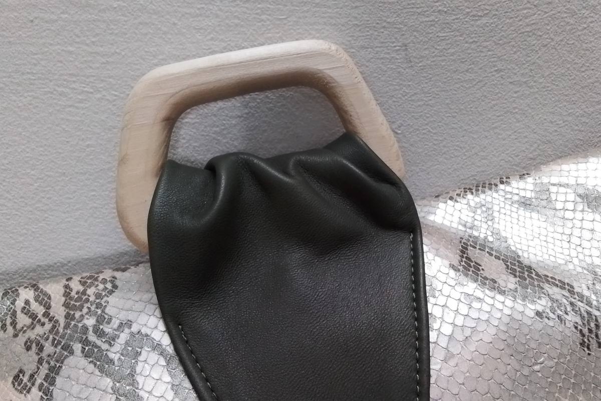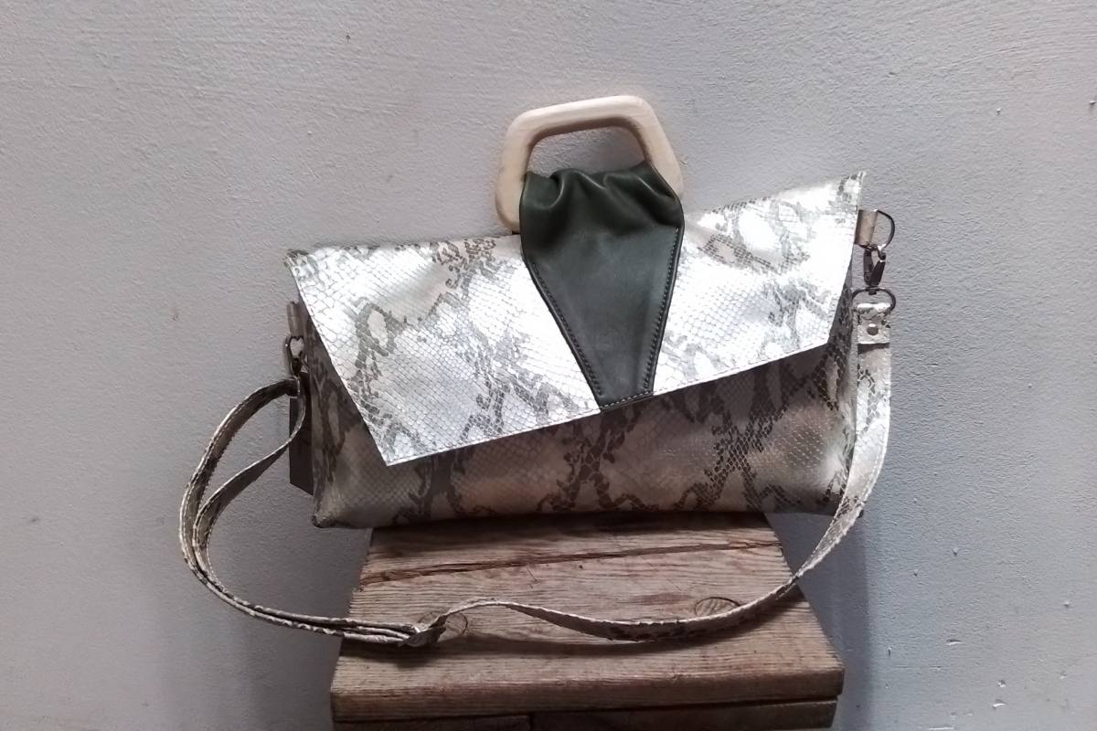 Torba je srednjevelika, unikatna, prostorna, priročna, modna,asimetrična.... Torba ima dodan lesen ročaj ki je tudi unikaten in asimetričnih oblik...in dolg pas za nošenje čez ramo....