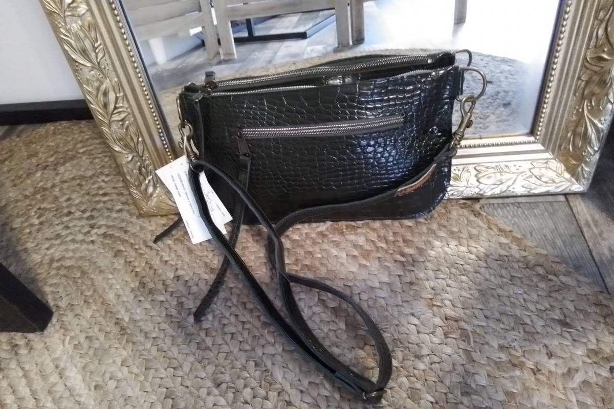Unikatna majhna torbica v olivno zeleni barvi z vzorcem krokodila. Torbica ima nastavljiv pas tako, da torbico lahko nosite na rami,čez ramo ali okoli pasu.Ta unikatna torbica ima spredaj žep na zadrgo za kakšno malenkost in ravno dovolj velika zavtelefon denarnico in še kaj.....