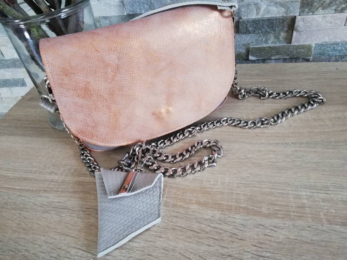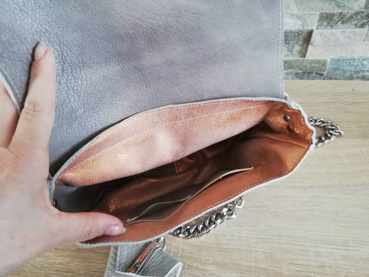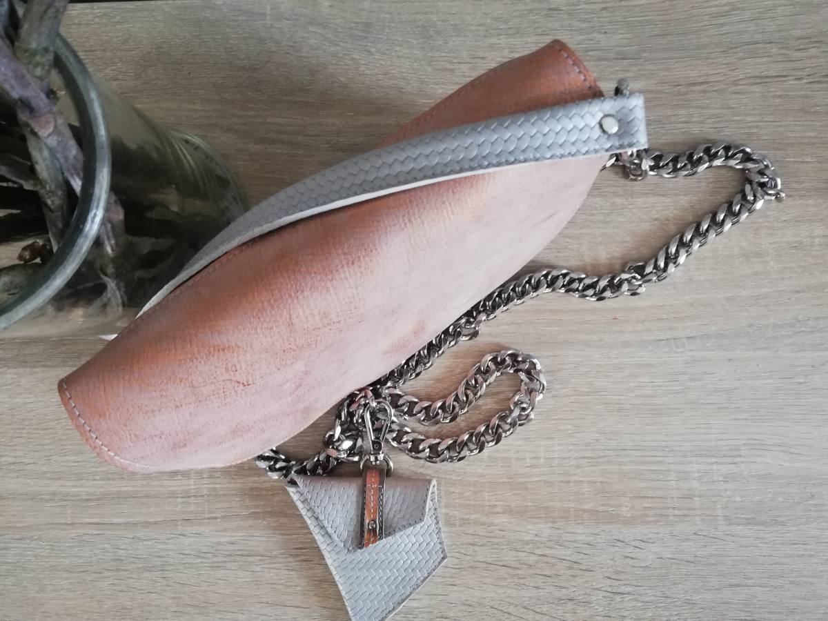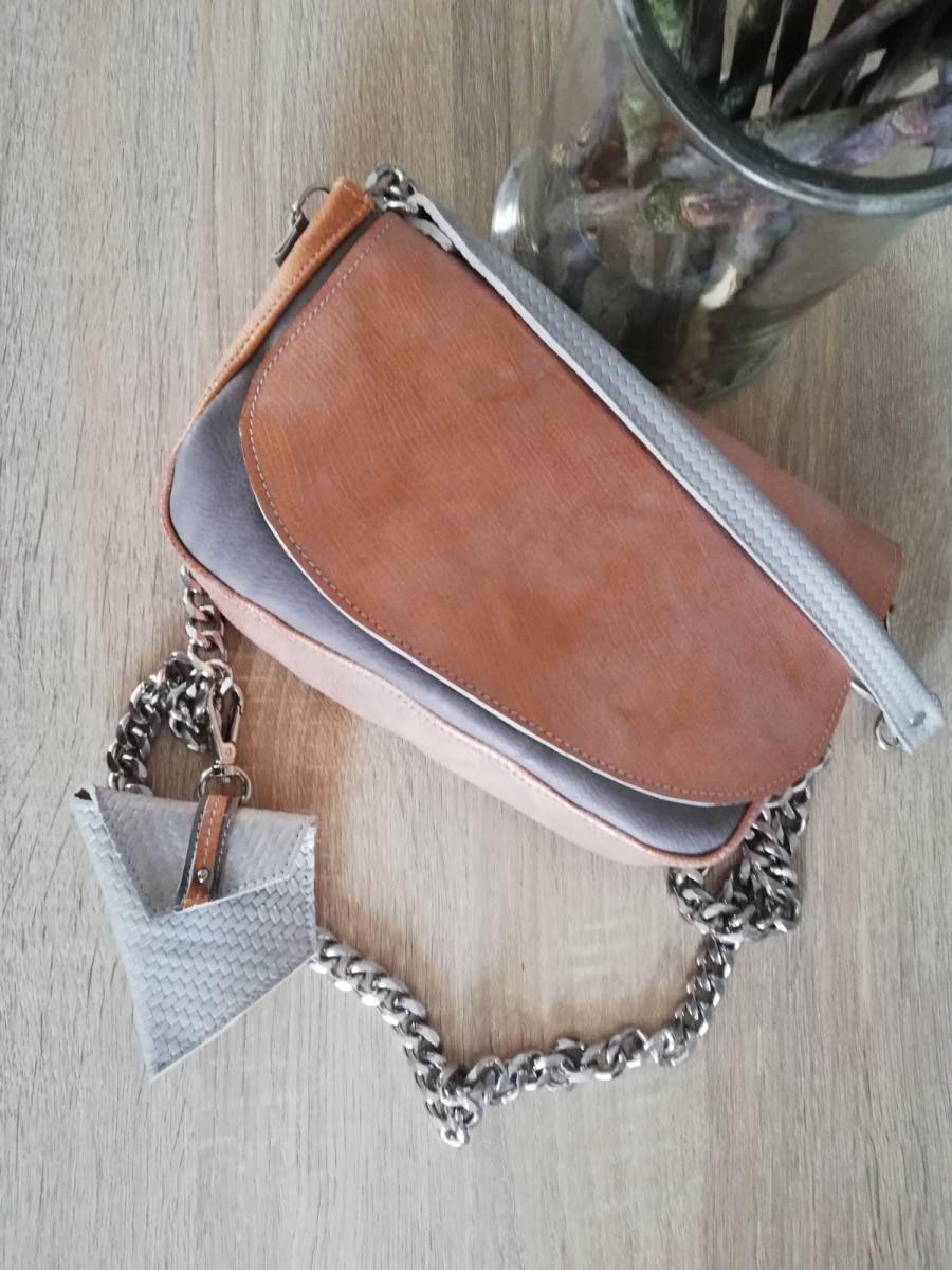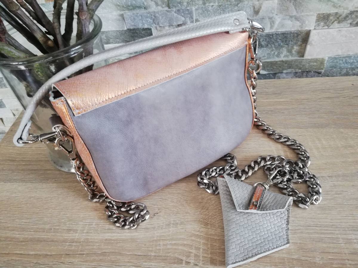 Unikatna manjša torbica v sivi barvi s kombinacijo s svetlečo oranžno barvo . Torbica ima krajši pas za nošenje v roki in daljšo ketnico za nošenje torbice čez ramo. Oba pasova sta snemljiva. Torbica ima dodaten obesek s predalčkom za drobiž, ki ga lahko pripnete kamorkoli na torbico ali pa enostavno snamete.